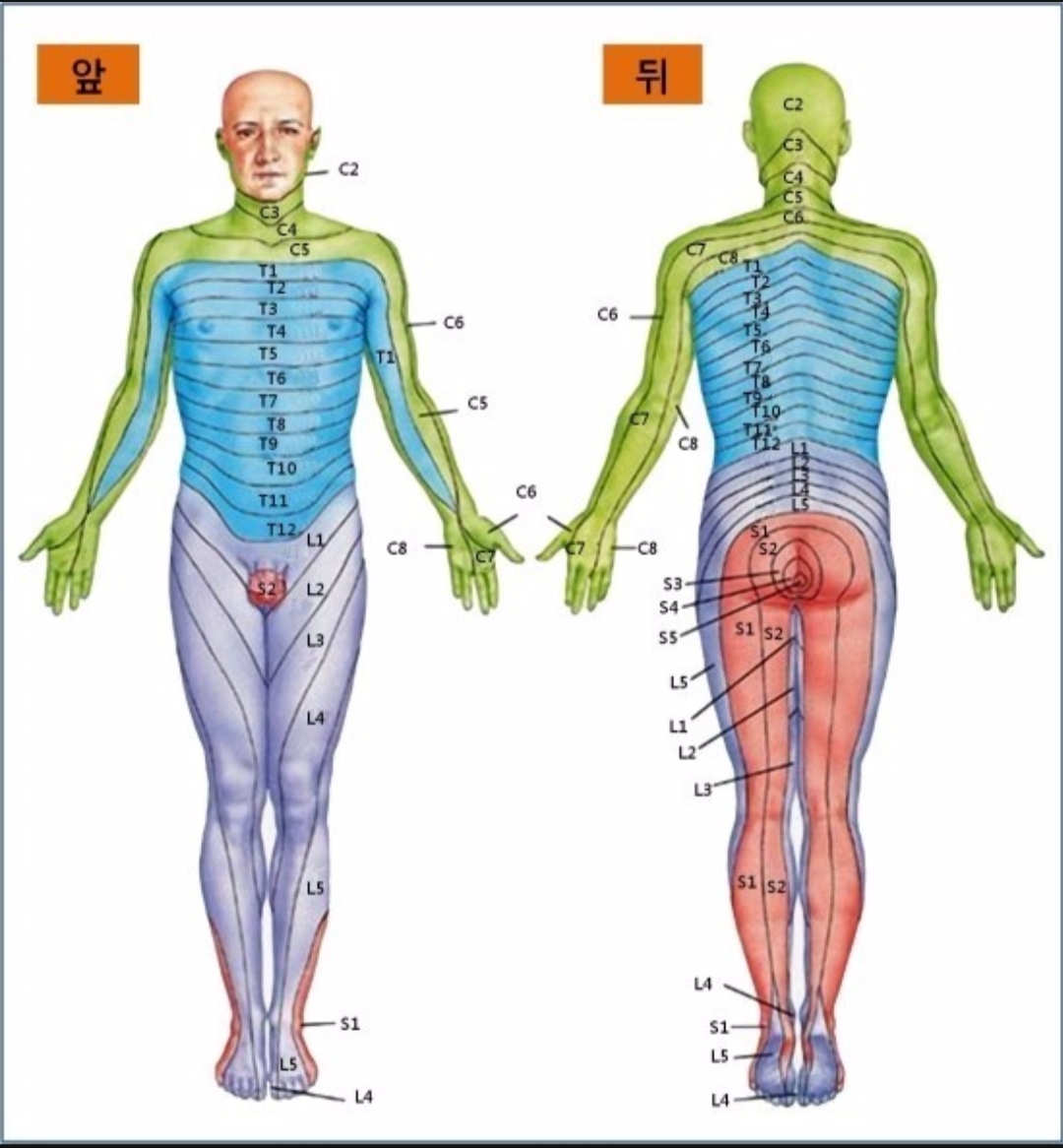 신경을 따라 증상이 몸의 한측면으로 발생하는 특징.